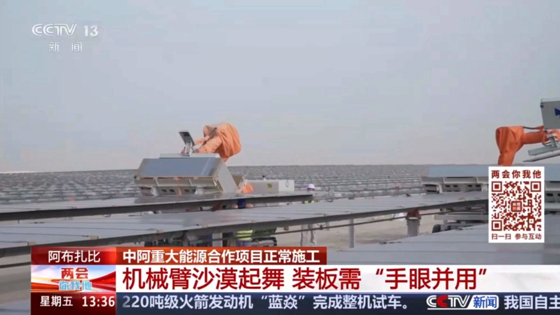 3月6日,中央廣播電視總臺全國兩會期間特別節目《兩會你我他》報道公司所屬華東院總承包的阿聯酋阿布扎比PV3阿吉班光伏項目。項目位于阿布扎比東北部,場區占地面積約20平方千米,項目直流側總裝機容量約1.8GW。該工程是阿聯酋政府落實“阿聯酋2050能源戰略”的重要項目之一,項目建設過程中將提供3000余個工作崗位,為當地居民就業提供支持。建成后,每年將為16萬戶家庭提供清潔能源,減少240萬噸二氧化碳排放。 報道鏈接:https://tv.cctv.com/2026/03/06/VIDEaE54OeOF7mZDwxEYLlY2260306.shtml 《兩會你我他》報道華東院總承包的阿聯酋阿布扎比PV3阿吉班光伏項目 機械臂開展作業 |